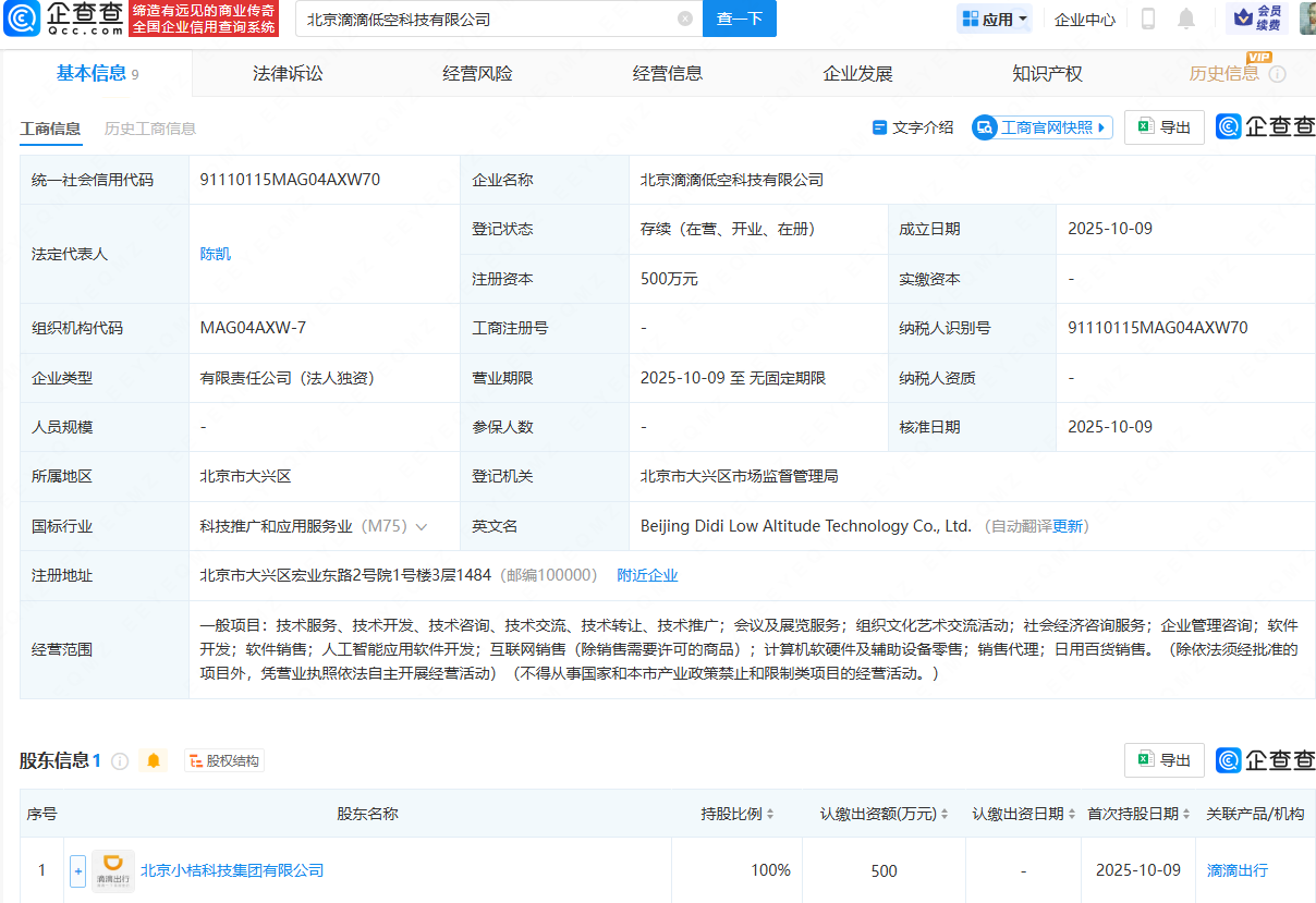 近日杠杆炒股平台,北京滴滴低空科技有限公司成立,法定代表人为陈凯,注册资本为500万元,经营范围包含:社会经济咨询服务;企业管理咨询;软件开发;软件销售;人工智能应用软件开发;互联网销售等。企查查股权穿透显示,该公司由滴滴出行关联公司北京小桔科技集团有限公司全资持股。